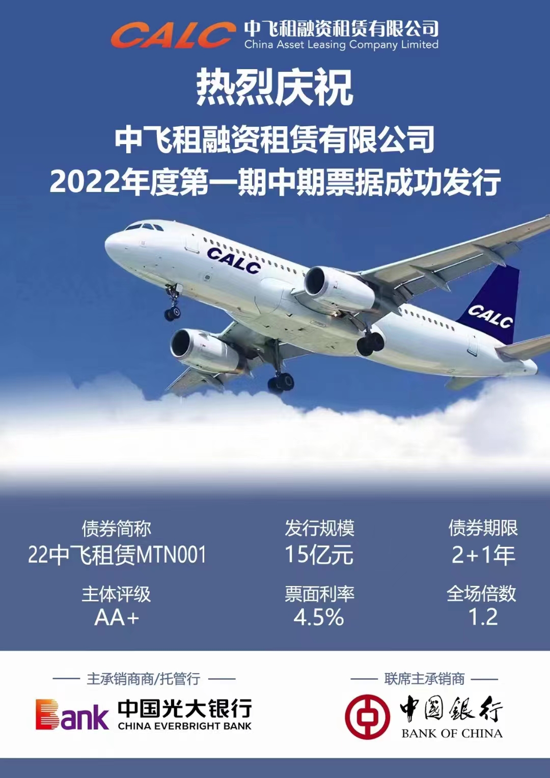 2022年4月14日,中国飞机租赁集团控股有限公司(“中飞集团”)欣然宣布旗下中飞租融资租赁有限公司(以下简称“中飞租(天津)” )成功发行2+1年期(附有第2年末发行人调整票面利率选择权及投资者回售选择权)15亿人民币中期票据,票面利率4.5%。
