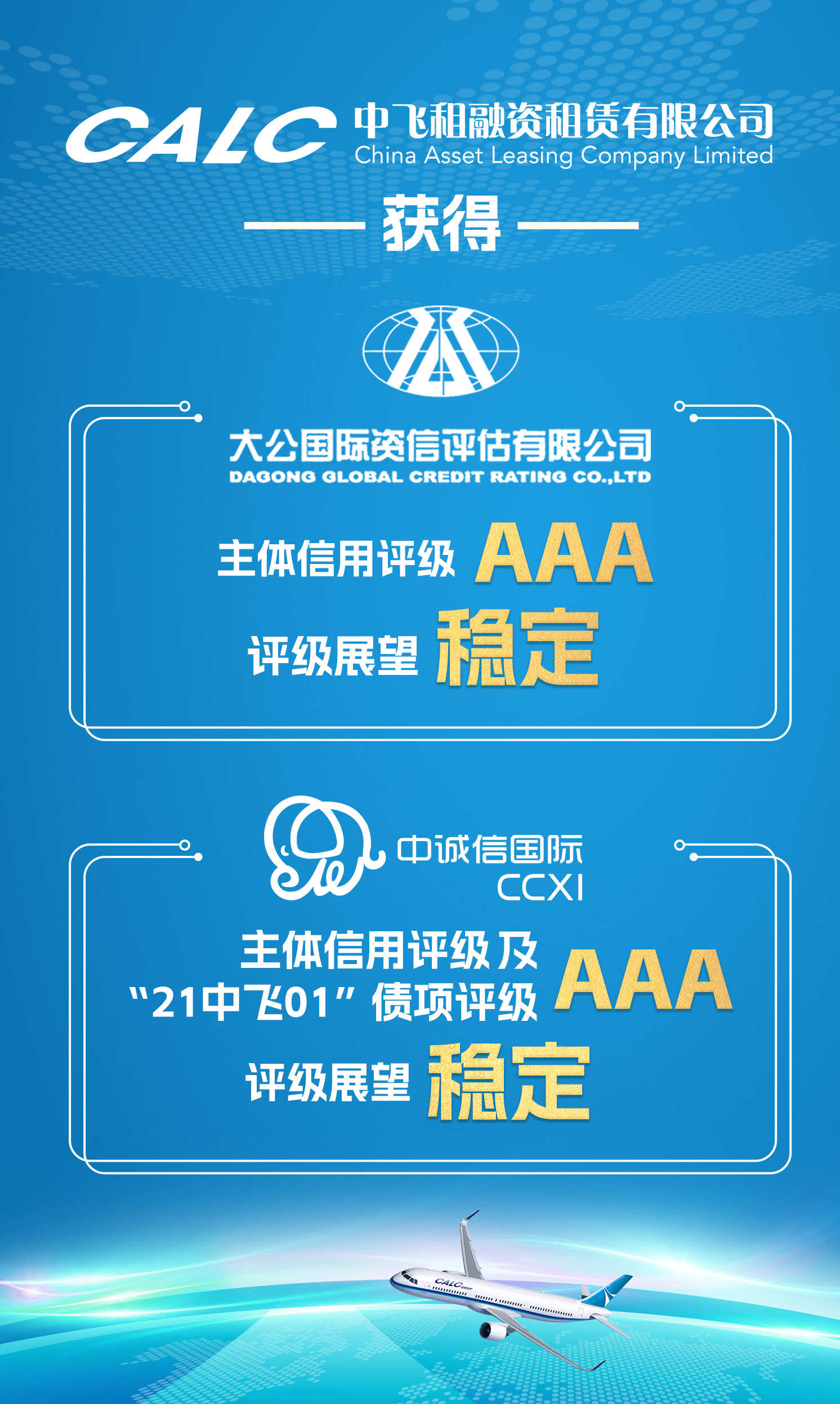 中国香港及天津 — 2023年5月31日,环球航空全产业链解决方案供应商 — 中国飞机租赁集团控股有限公司(“中飞租赁”或“集团”,香港联交所股票代号: 01848)宣布,旗下中飞租融资租赁有限公司(“中飞租( 天津)”或“公司”)获国内权威信用评级机构—大公国际资信评估有限公司(“大公国际”)给予AAA主体信用评级,同时获得中诚信国际信用评级有限责任公司(“中诚信国际”)上调主体信用评级及 “21中飞01”债项评级至AAA等级,展望皆为稳定。本次评级结果彰显权威评级机构对于中飞租(天津)综合实力的肯定,凸显公司在航空业整体受冲击的背景下逆风而上的业务发展势头和经营稳健的基本面。