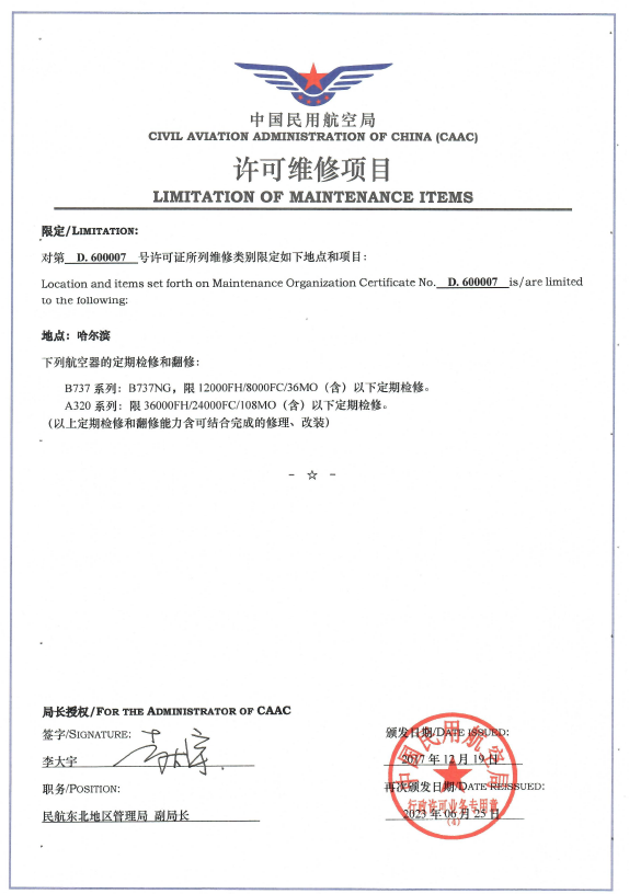 5月中旬,民航东北管理局和黑龙江监管局组织了专门的项目审查组,对中龙欧飞“A320 3C定检能力申请项目”进行了现场审核,对中龙欧飞的生产、质量、工程、计划及培训等部门各个流程环节进行了全面细致的审核,经过初审和复审,最终完成了该项目的批准。