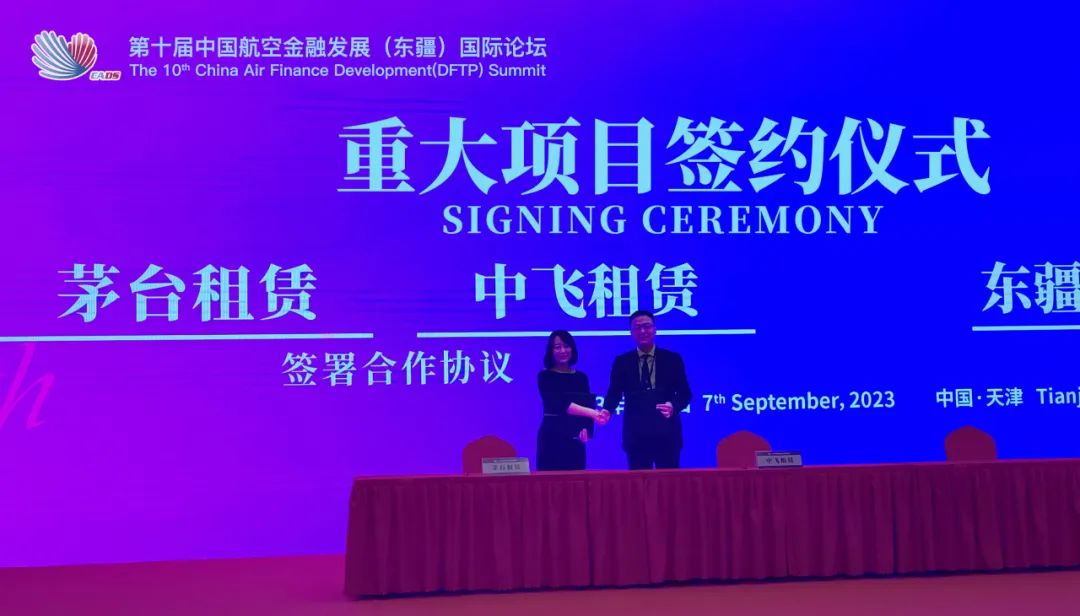 在此次會議的簽約環節,中飛租賃集團全資子公司中飛租(天津)與茅台租賃就離岸及在岸飛機租賃、國產噴氣式大飛機出海等航空產業鏈相關領域的深化合作達成戰略合作協定,天津市常務副市長劉桂平和東疆管委會主任楊柳共同見證簽約儀式。目前,中飛租賃與茅台租賃合作的合資平台已完成兩架飛機的注入,並且已確定合作意向,後續還將陸續注入更多飛機資產。雙方將本著“戰略協作、平等互利、長期穩定、共同發展”的基本原則開展合作,共同助力中國航空租賃業發展。